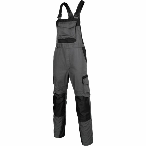 Die Latzhose besteht aus einem robusten Mischgewebe aus 65% Polyester und 35% Baumwolle.