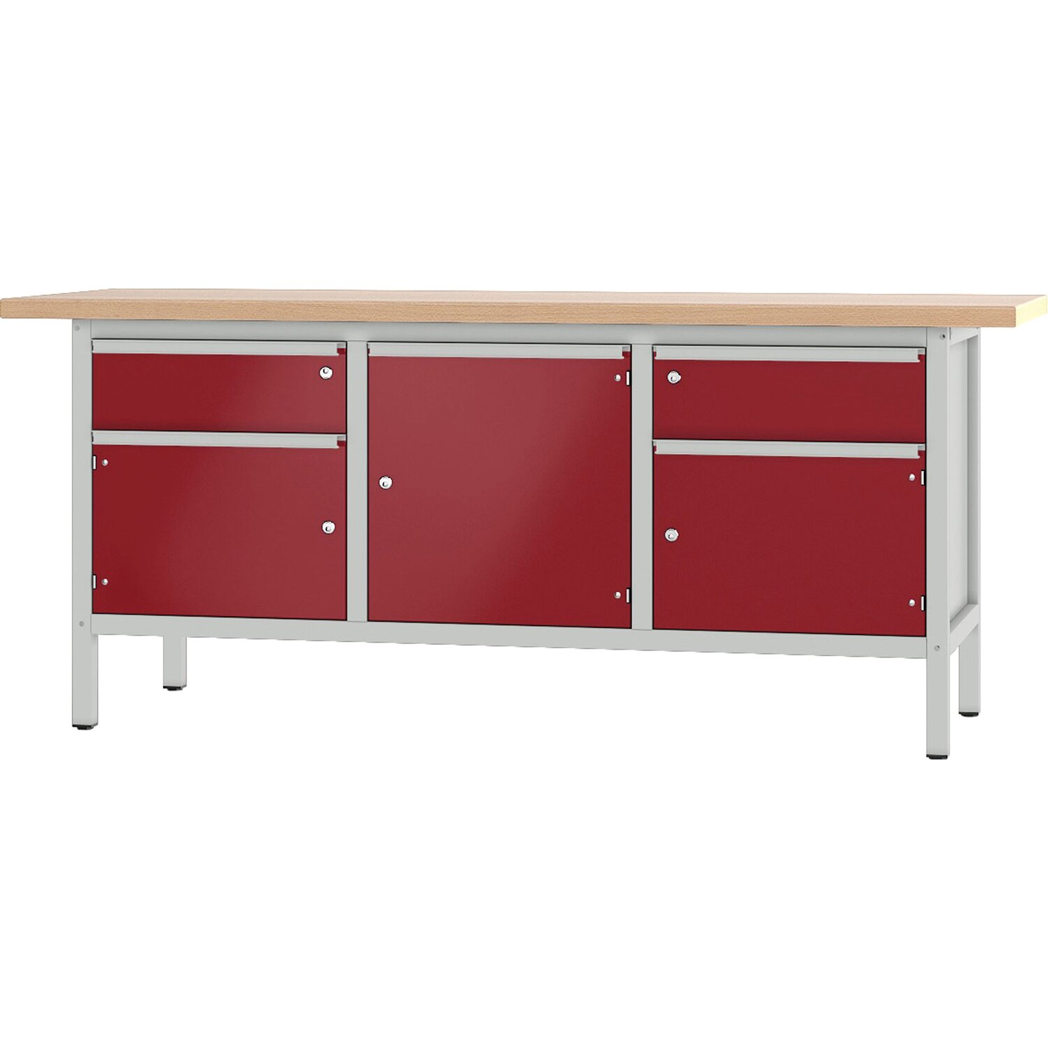 Die Werkbank ist in der Farbkombination Lichtgrau-Rubinrot gehalten. Das Gestell ist lichtgrau pulverbeschichtet, während die Türen und Schubladenfronten in einem satten Rubinrot erstrahlen.