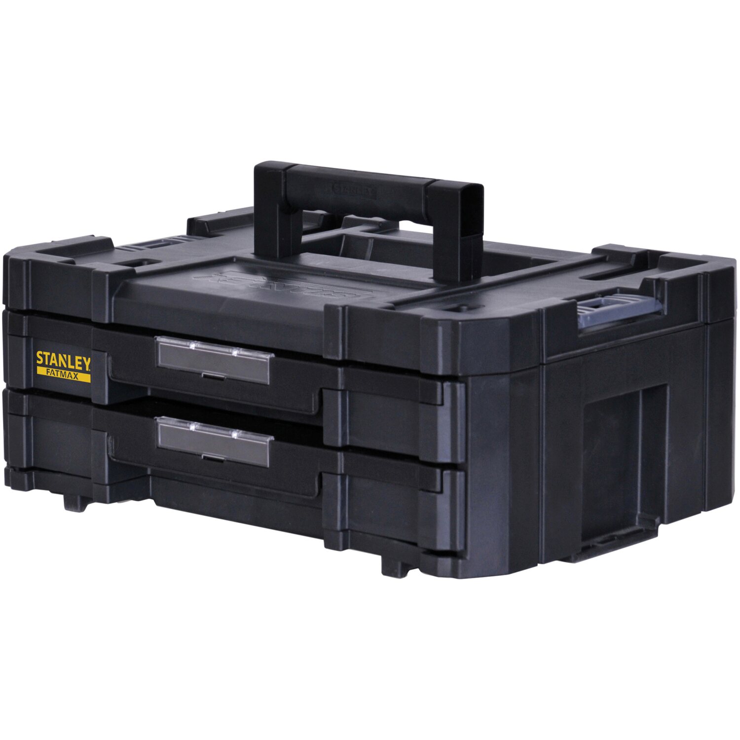 Das Herzstück des Stanley FatMax TStak IV sind die zwei geräumigen Schubladen. Sie bieten ausreichend Platz für eine Vielzahl von Werkzeugen, von Schraubenziehern und Zangen bis hin zu Messwerkzeugen und Kleinteilen. Die Schubladen sind leichtgängig und lassen sich auch bei voller Beladung einfach öffnen und schließen. So hast du jederzeit schnellen und bequemen Zugriff auf deine Werkzeuge.