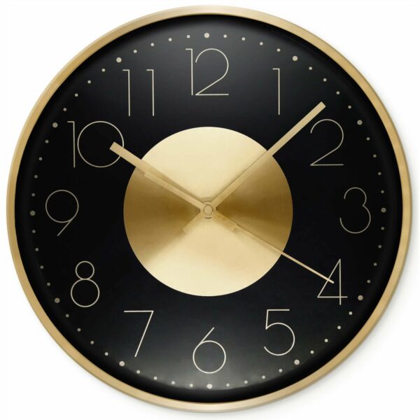 Das Zusammenspiel von goldenen Akzenten und tiefem Schwarz verleiht der Uhr eine zeitlose Eleganz, die sich nahtlos in verschiedene Einrichtungsstile einfügt. Das schlichte, moderne Design harmoniert sowohl mit minimalistischen als auch mit klassischen Interieurs und sorgt für eine stilvolle Akzentuierung Ihrer Räume.